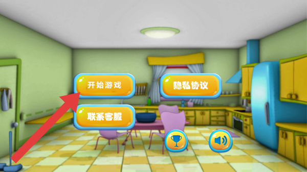 1、实体信息有“开始游戏”“隐私协议”“联系客服”等按钮,呈现出厨房场景,主要是启动前的功能选择界面,点击方可进入。
