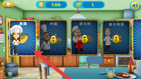 2、实体信息有代表不同国家的厨师角色卡片,部分角色处于锁定状态,还有金币、黄油数量显示,呈现厨房场景,是选择不同国家美食烹饪关卡的界面。