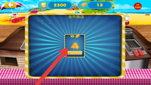 3、显示金币数量、黄油数量,还有可购买的“10金币”道具(花费10获取10,是花费一定资源兑换10金币),背景为海滩烧烤场景。