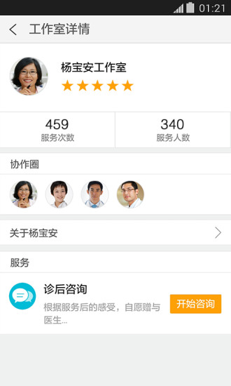 4.协同工作室,给您更权威的诊疗建议 。不仅看诊医生本人可以提供咨询服务,而且通过看诊医生的人脉关系建立协作团队,共同为患者服务,从而在复杂情况下给出更全面的分析及更权威的诊疗建议。
