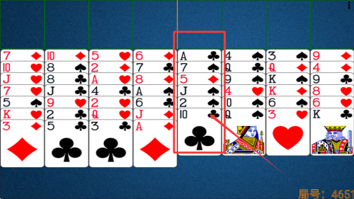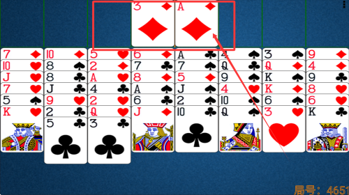 1、基础玩法是在右上角四个回收单元中各完成一叠牌,每叠必须包含13张同花色纸牌,按照从A到K的顺序排列。