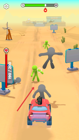 1、驾驶战斗:操控红色汽车在沙漠道路行驶,撞击绿色敌人。