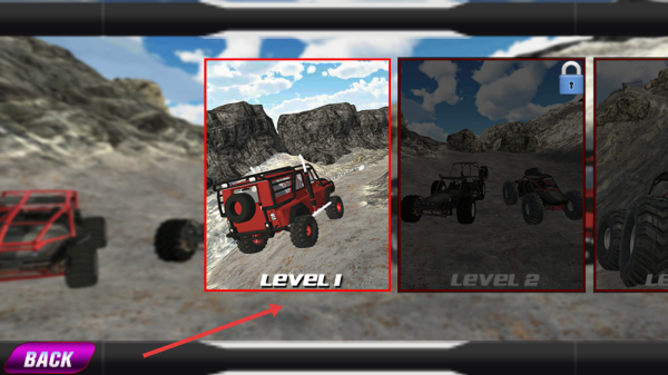 2、在关卡选择页,选【LEVEL1】,驾驶红色越野车开始挑战。