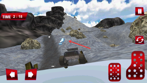 3、操控越野车,在山地赛道行驶,避障并收集蓝色道具,冲向终点。