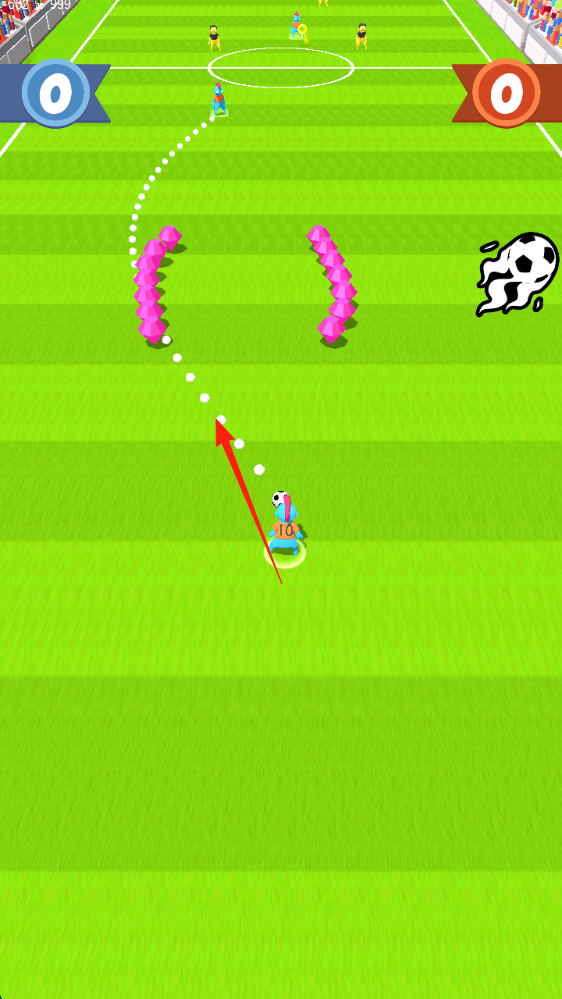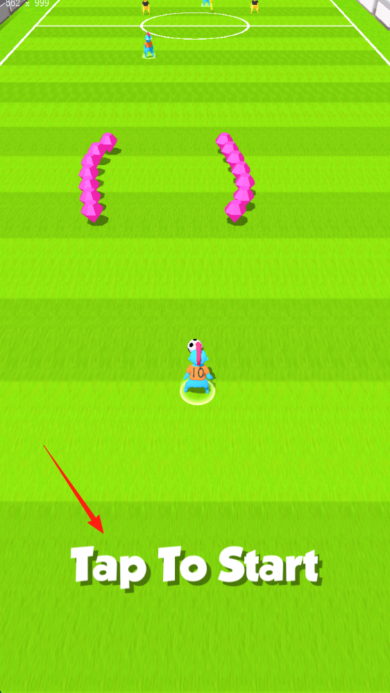 1、开局引导“TapToStart”点击开始,蓝色球员(10号)在足球场,需带球穿过粉色障碍,向对方半场推进。