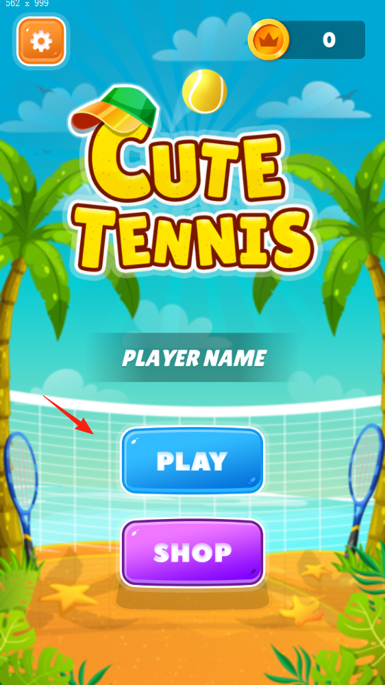 1、模式选择主界面点“PLAY”开始比赛,“SHOP”购道具,场景为沙滩网球场,角色名自定义。