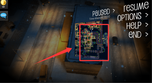 1、暂停界面,看地图【红框区域】,规划路线,选“resume”继续,“options”调设置,“help”查攻略,“end”退出。