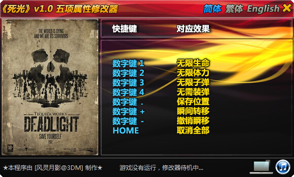 死光风灵月影修改器是由玩家风灵月影专为游戏《死光》打造的修改工具,提供无限生命。无限体力、无限子弹、无需装弹等功能,可以帮助降低游戏难度。对于一些新手玩家来说,该修改器还是很实用的。赶快下载体验吧!