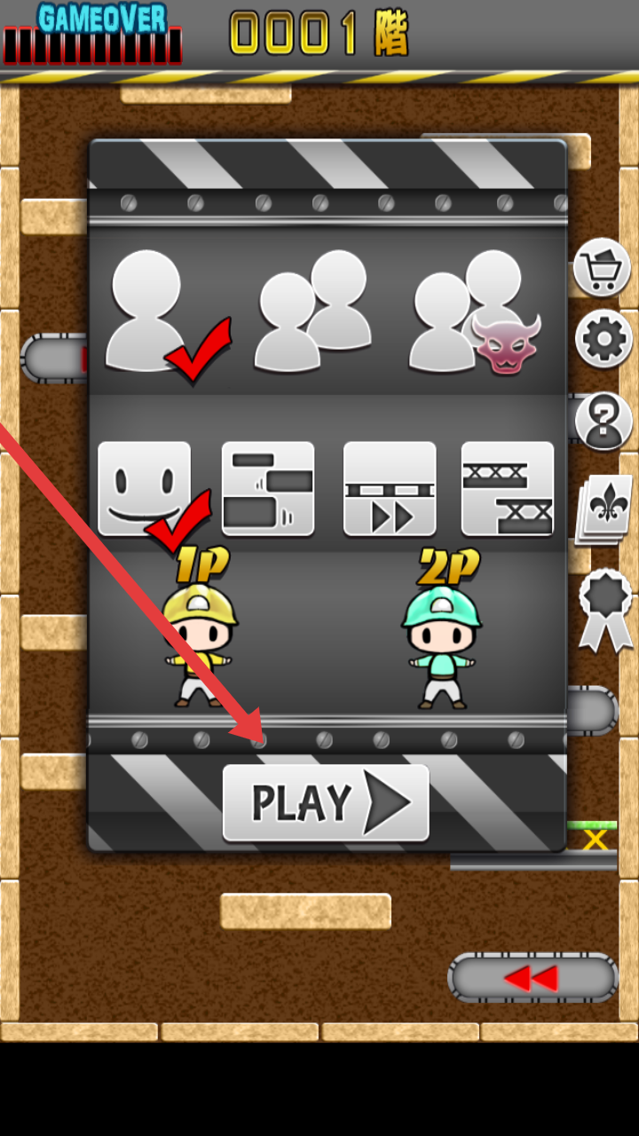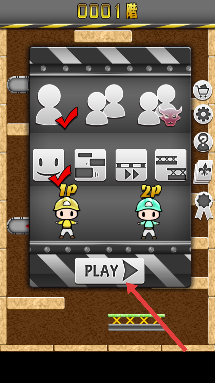 1、选角界面确认1P角色(黄帽小人)选中后,点击箭头指向的【PLAY】按钮,进入0001階关卡。