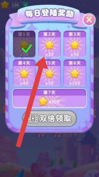 1、进入游戏,先领“每日登陆奖励”(红箭头指向第2天),获取道具,助力消除闯关。