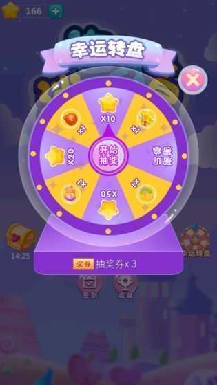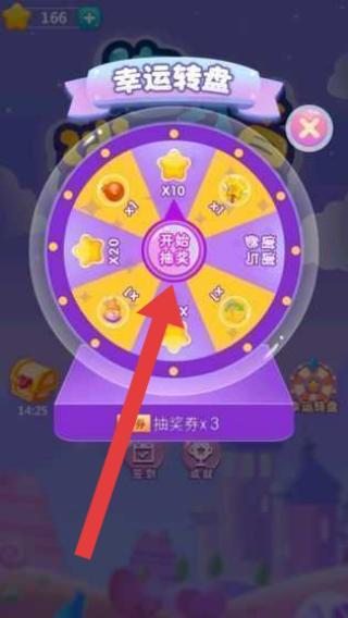 3、参与“幸运转盘”,点“开始抽奖”(红箭头指向),消耗抽奖券,赢取星星、道具奖励。