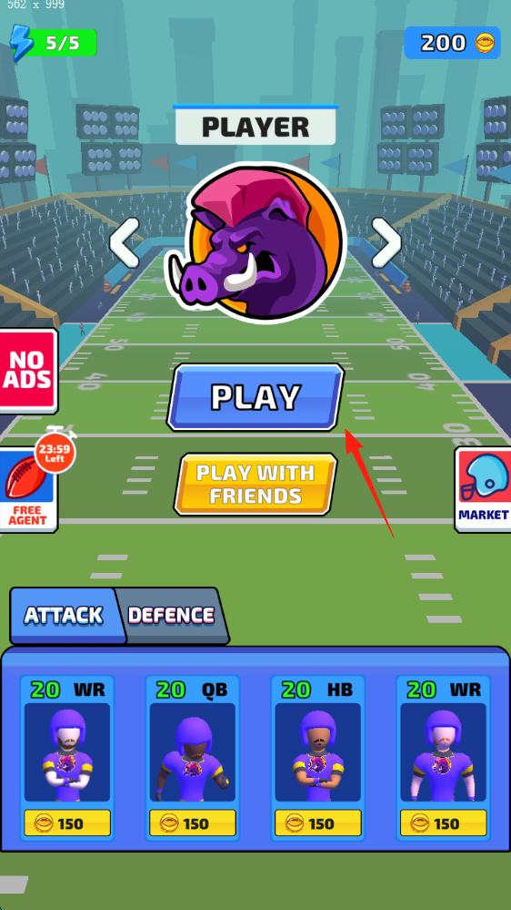 1、模式选择主界面选“PLAY”单人赛或“PLAYWITHFRIENDS”多人赛,控制紫色野猪队,可升级球员(WR、QB等)。