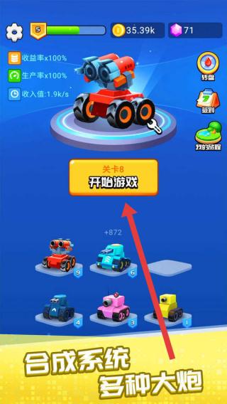 1、在主界面,点击【开始游戏】(关卡6),进入射击游戏,操控合成后的大炮,开启挑战。
