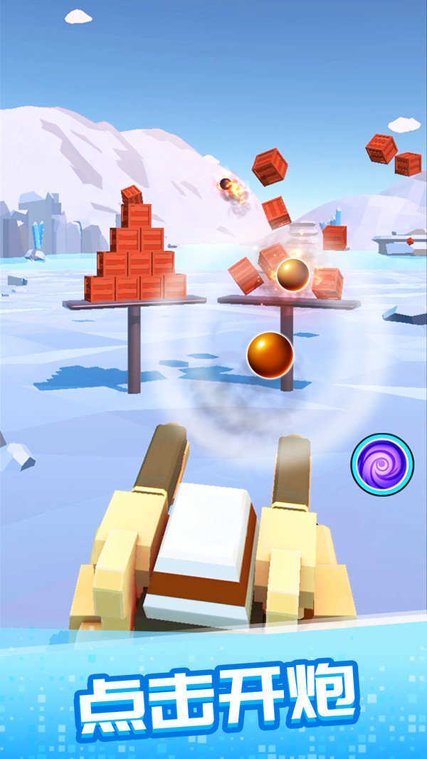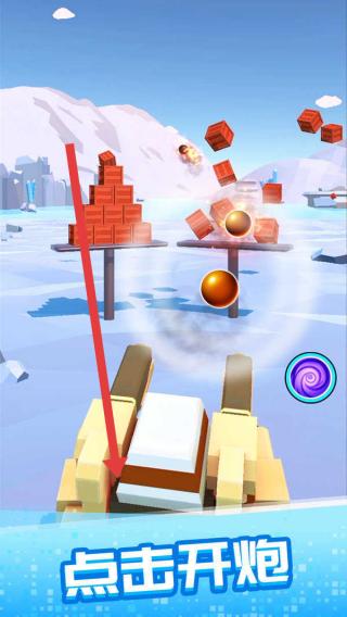 2、关卡中,点击开炮(红箭头指向),发射炮弹,摧毁冰原场景的方块建筑,推进进度。