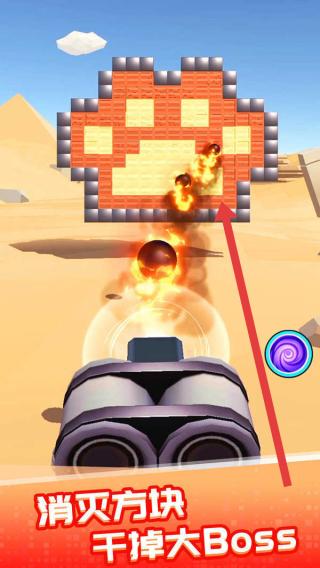 3、在沙漠关卡,瞄准方块Boss(红箭头指向),精准射击,消灭目标,完成“消灭方块干掉大Boss”任务。