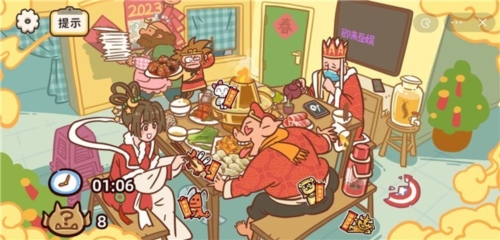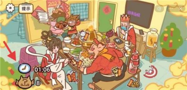 2、观察场景:查看角色、火锅等元素,左侧时间、道具数及提示按钮。