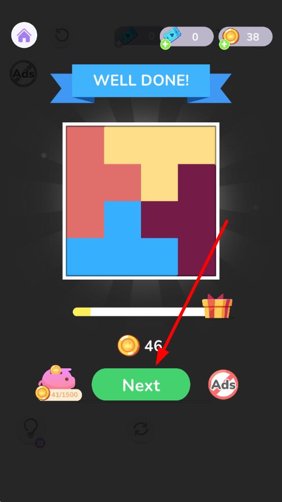 3、成功拼接完整方格完成关卡,获取奖励解锁新关卡,挑战更复杂的方块拼接。