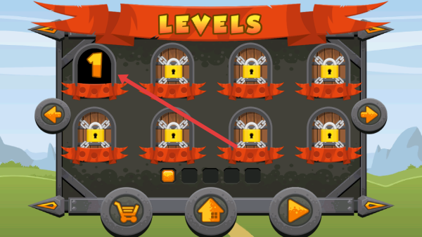 3、在关卡页,点击已解锁的“LEVEL1”(红箭头指向),进入第一关,用弹弓弹射,完成任务。