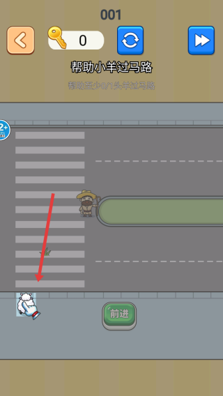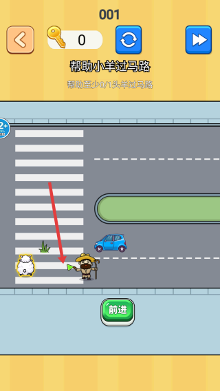 3、引导通行:点击“前进”,操控农夫引导小羊避开车辆,完成过马路。