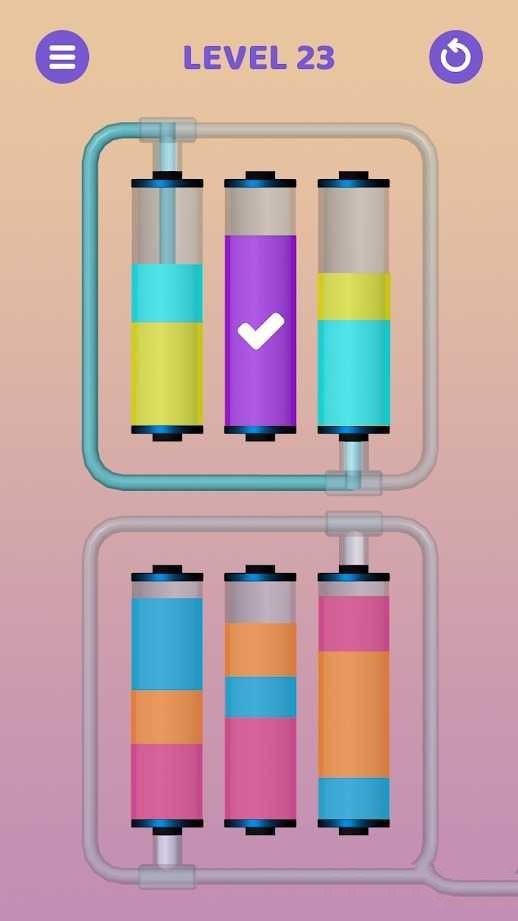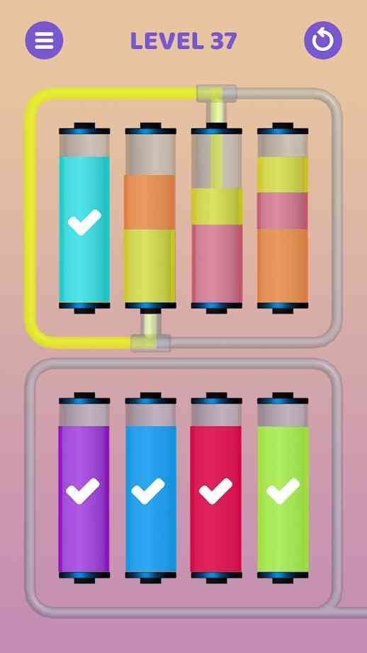 2、解谜系统:通过观察、思考与操作完成解谜,合理利用液体特性与试管容量规划倾倒顺序,连续成功操作触发连击加成,获得额外星星与奖励,灵活应对不同类型的关卡与挑战。