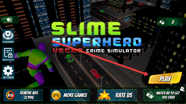 1、在主界面,点击【PLAY】,进入《Slime-Superhero》,开启维加斯犯罪模拟冒险。