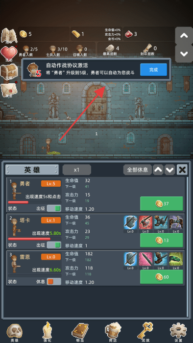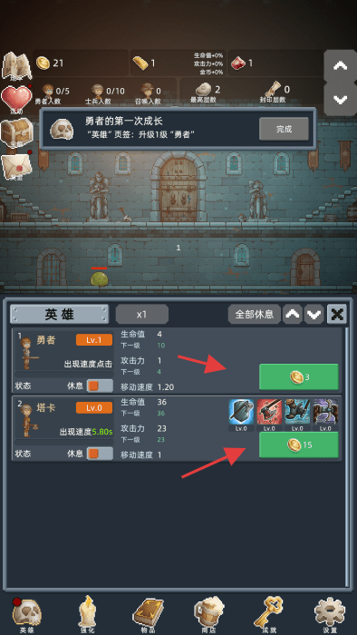 2、在英雄界面,消耗金币升级勇者、伙伴(如塔卡),提升生命值、攻击力等属性,增强战力。