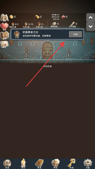 1、进入游戏,点击地牢区域,完成“初遇勇者之光”任务,召唤勇者,开启冒险之旅。