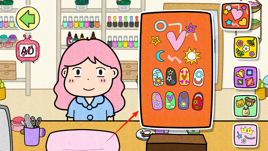 1、多样风格自由选择:可根据客人需求用各色指甲油与可爱贴纸打造专属设计,从清新简约到华丽繁复,满足不同审美偏好,让每一款美甲都独具特色,展现玩家的创意与时尚品味。
