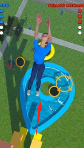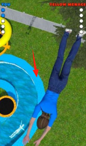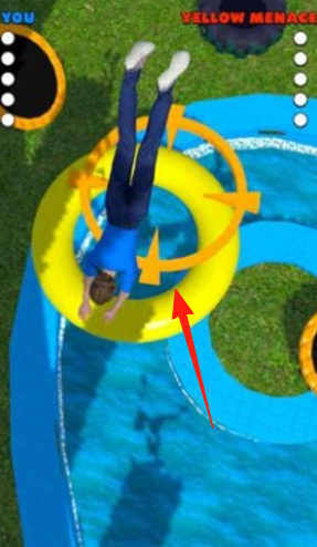 1、滑行操作控制蓝色角色,从高处滑下,经过螺旋滑道、心形水池、环形浮圈,保持平衡。