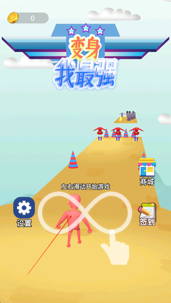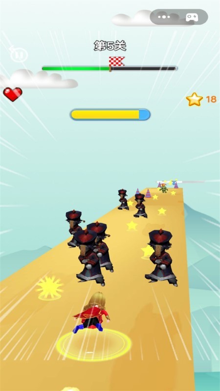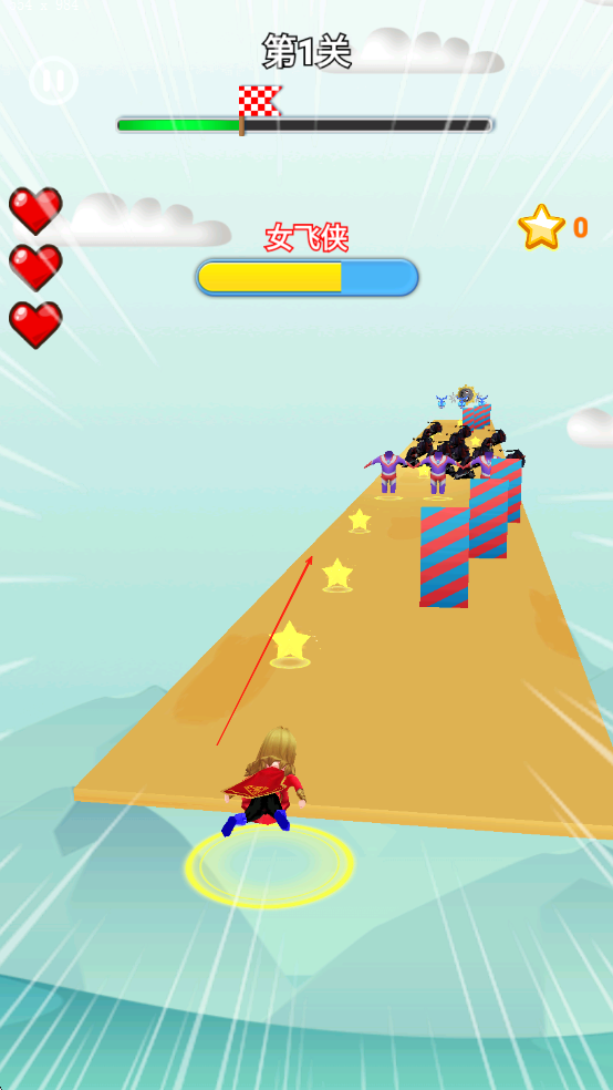 1、进入游戏后操控角色在跑道上左右滑动躲避障碍,长按屏幕跳跃越过深渊,当跑道出现金色能量星星时,调整路线全部拾取以激活变身条。