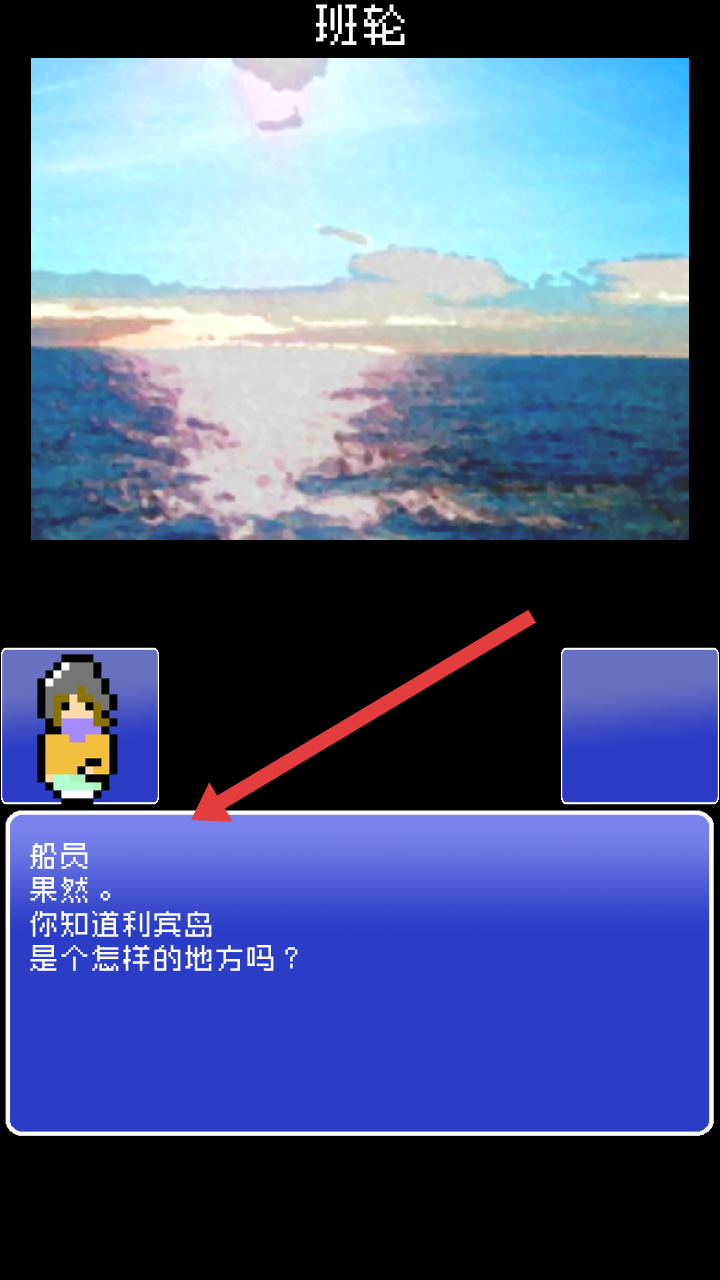 3、进入游戏剧情,推进对话交互,回应船员关于【利宾岛】的提问,开启故事探索。