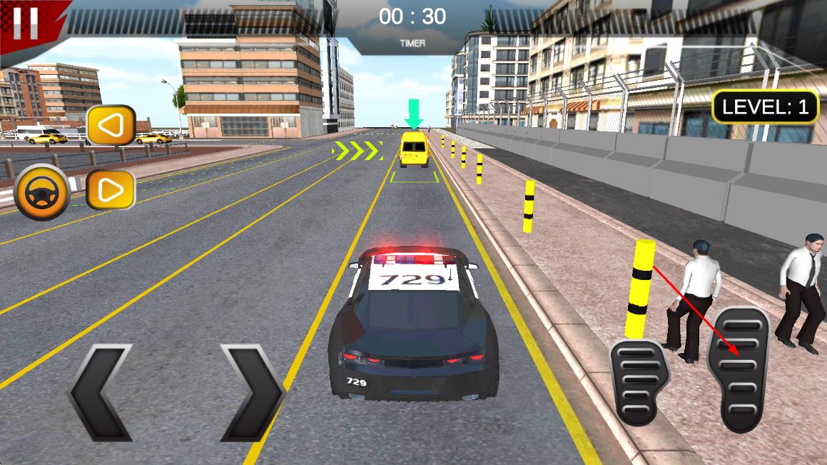 1、进入游戏后在车辆选择界面挑选警车,点击开始关卡进入场景,通过教程熟悉方向盘与刹车油门操作。