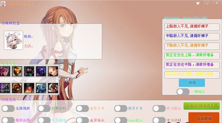 冰封lol助手是一款专门为英雄联盟玩家设计的游戏辅助工具,为玩家提供血量显示、炮塔范围、补刀提示、游戏换肤、无限视距等功能,让你在游戏的世界中更好的去战斗,有需要者欢迎下载!