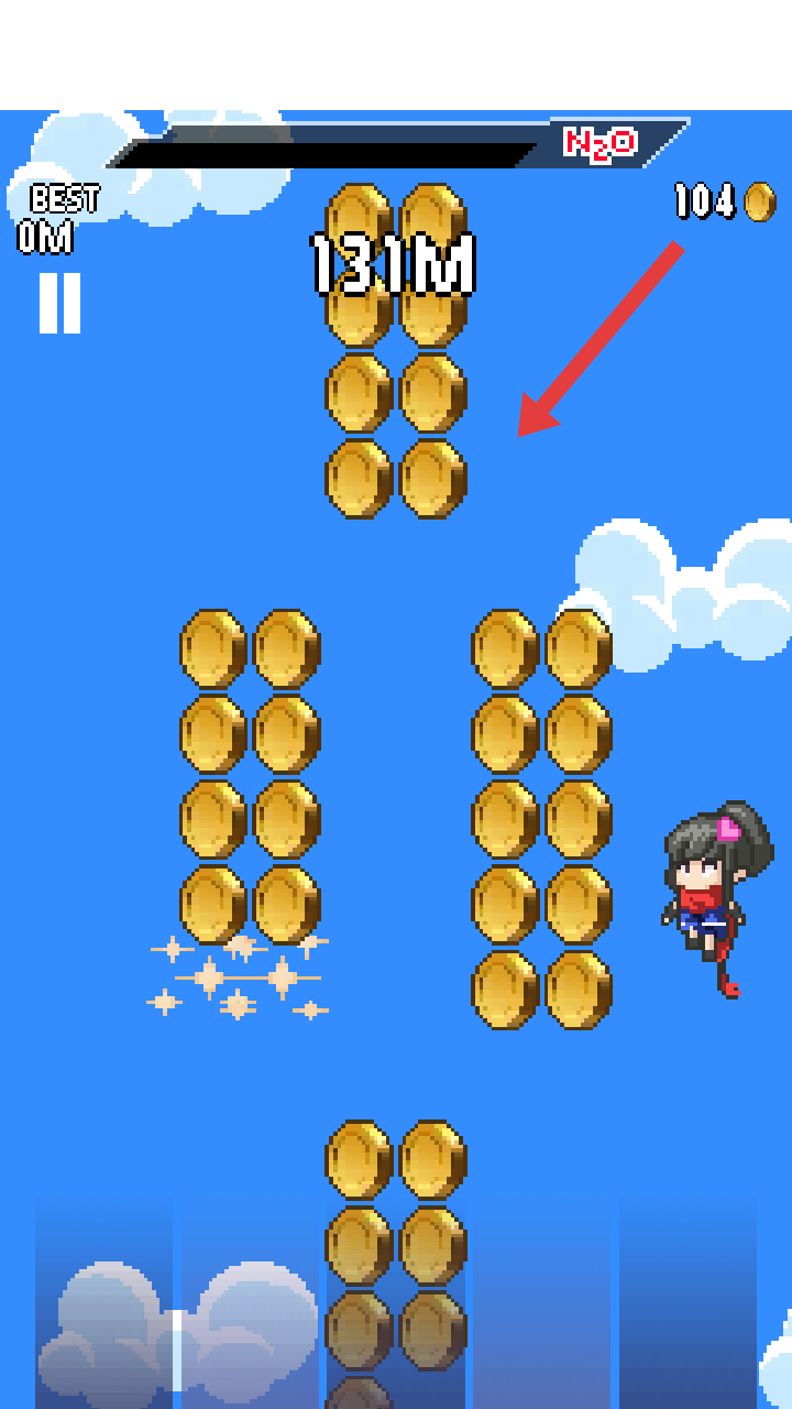 3、游戏过程中,操控角色跳跃收集金币,提升高度(如当前131M),积累金币和最佳成绩(BEST)。