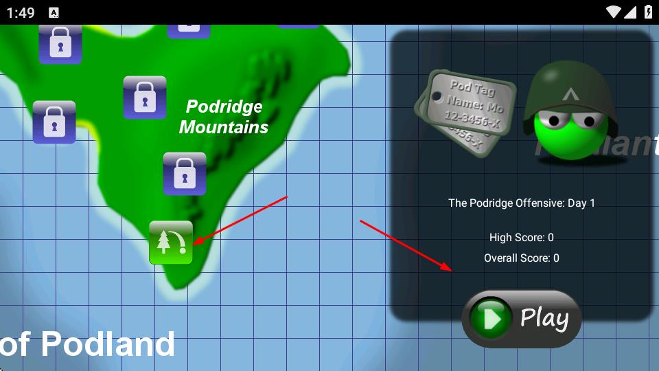 1、进入游戏,在世界地图选择“PodridgeMountains”等区域关卡,点击“Play”开始战斗挑战。