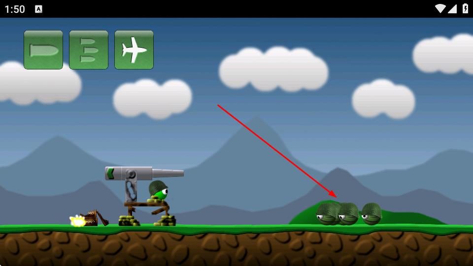 2、操控炮兵,瞄准场景中敌人(绿色怪物),点击发射按钮,利用炮弹攻击,清除敌方目标。