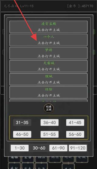 1、点击【一个人点击打开主城】,进入对应主城区域,推进游戏进程。