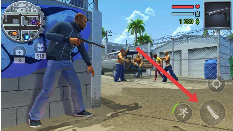 1、在街头场景,点击箭头指向的武器/动作按钮,切换攻击模式(如开枪),对抗敌对势力,推进任务。