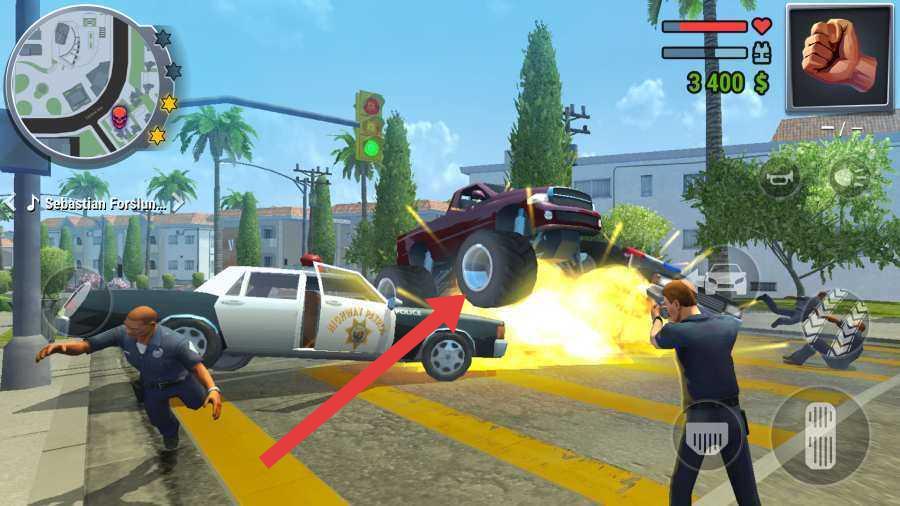 2、遭遇警车追捕,操控车辆,利用地形(如路口)撞击警车,触发爆炸,摆脱追捕,提升犯罪星级。