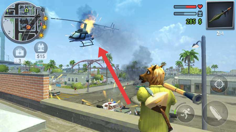 3、在屋顶战斗,操控马头角色,点击箭头指向的直升机,用火箭筒攻击,摧毁空中目标,完成高难度挑战。