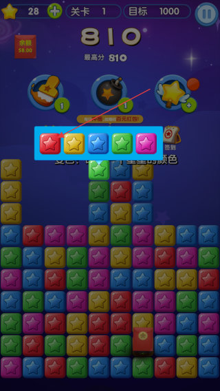 1、进入关卡1,观察彩色星星分布,点击相邻同色星星消除,积累分数冲击目标。