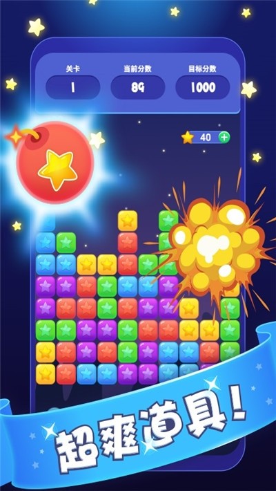 2、合理使用上方道具(如炸弹),点击释放清除大片星星,助力快速达成目标分数。