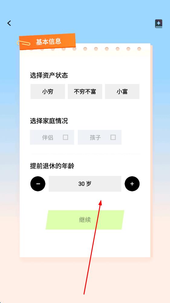1、初次踏入游戏,点击“第1轮模拟”,率先设定自己的基本信息,如资产状况、是否有家人陪伴,以及期望开启提前退休生活的年龄等,为后续的模拟之旅奠定基础。