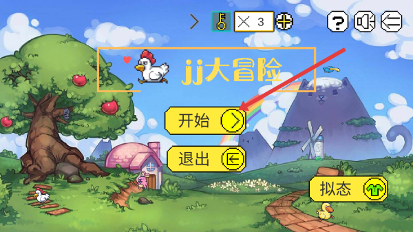 1、在游戏主界面,点击【开始】按钮,进入《jj大冒险》,开启田园风场景的冒险之旅。