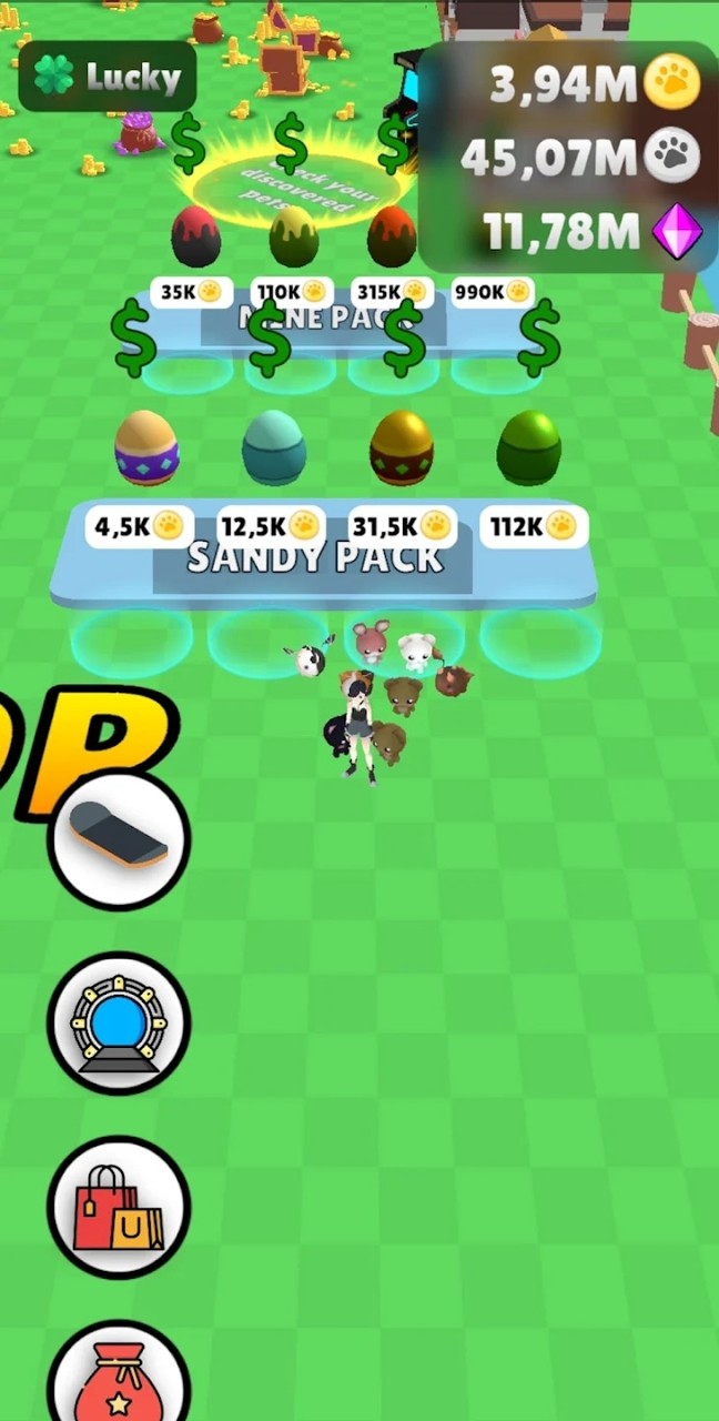 2、进入宠物蛋界面,点击“SANDYPACK”等蛋包,消耗对应货币,孵化获取新宠物。