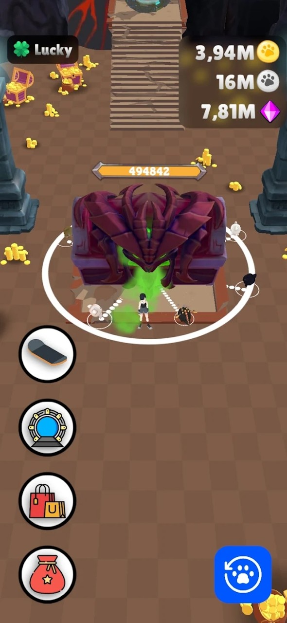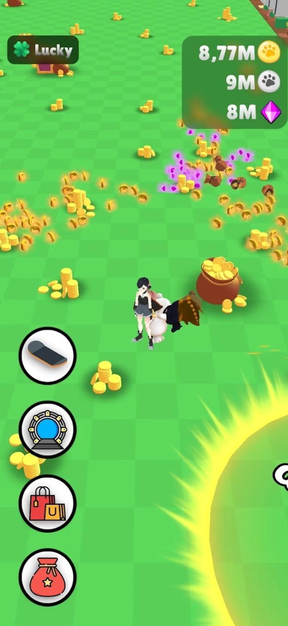 3、在金币场景,操控角色移动,带领宠物收集金币、宝箱,积累资源,提升宠物实力。