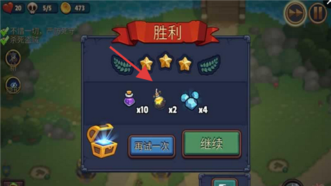 3、战斗胜利后,在结算界面领取紫晶、道具、蓝晶等奖励,点击“继续”开启新挑战。