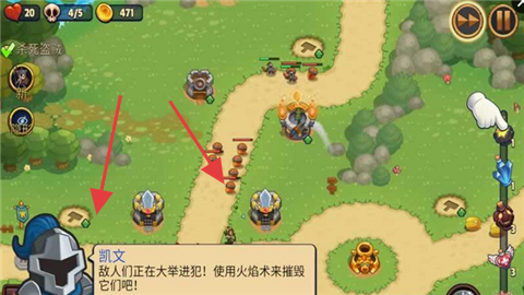 2、进入战斗,布置防御塔,响应“凯文”等提示,用火焰术等技能,阻止敌人“大举进犯”,守护阵地。