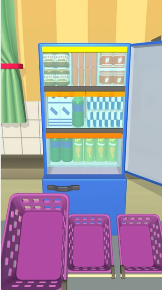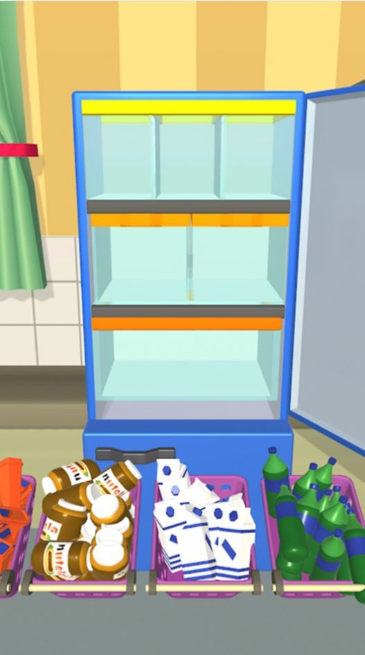 2、物品放完后,清空的篮子移到指定位置,完成冰箱整理,进入下一关。
