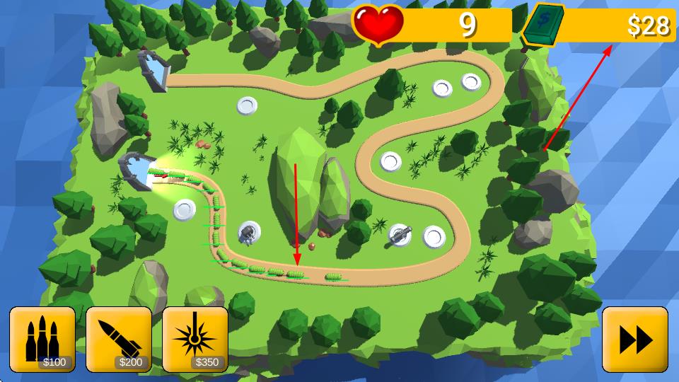 2、敌人出现后,防御塔自动攻击,留意生命值,若敌人突破防线会扣除,需及时补充或升级防御。